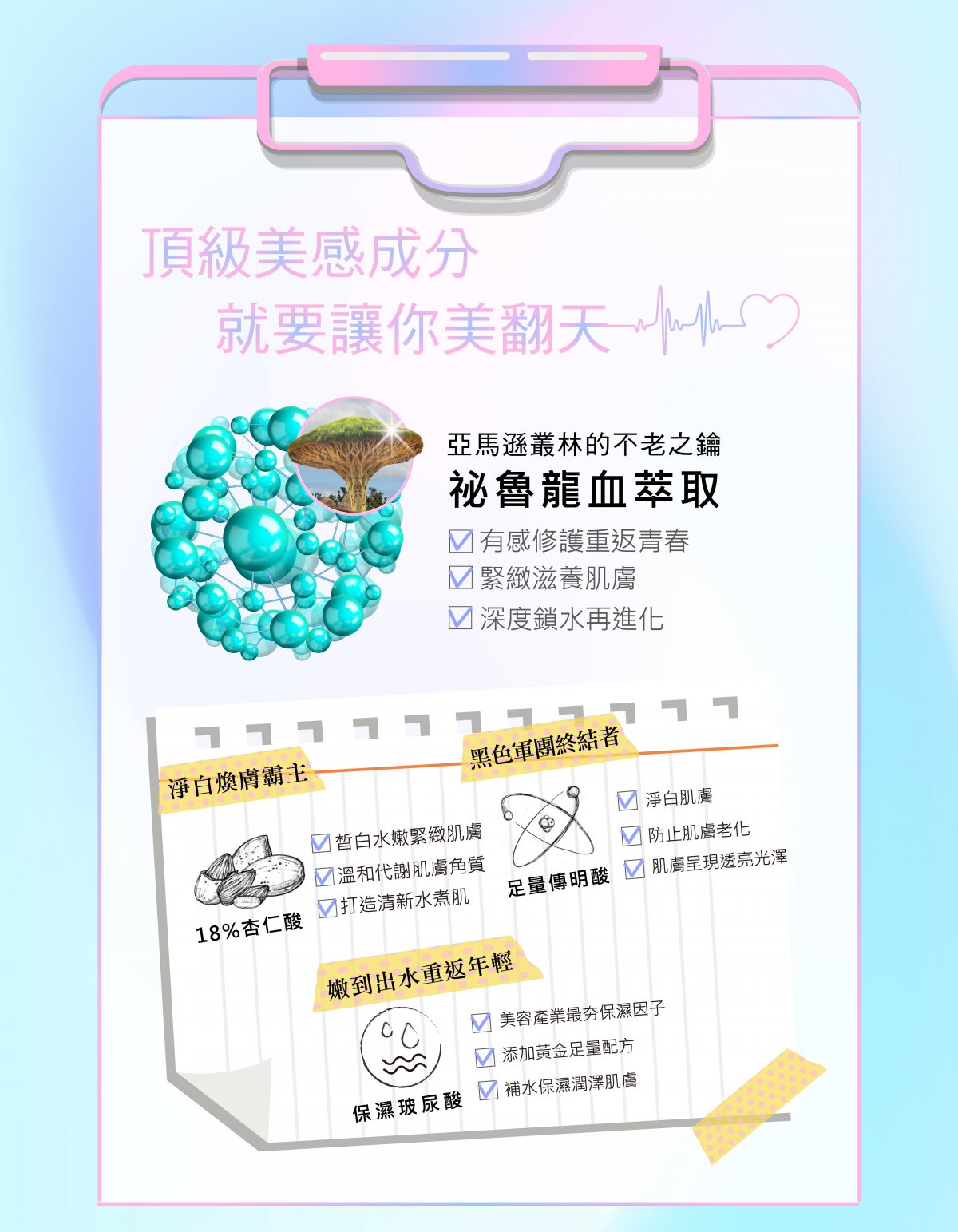 主打緊緻亮膚,撫平細紋,打造水潤光采肌。