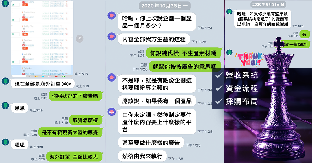 他原本只是想找幾位網紅合作、投廣告、調素材,但聊著聊著,他突然說:「你來幫我決定產品內容、定價、廣告方向,我來執行,這樣可以嗎?」